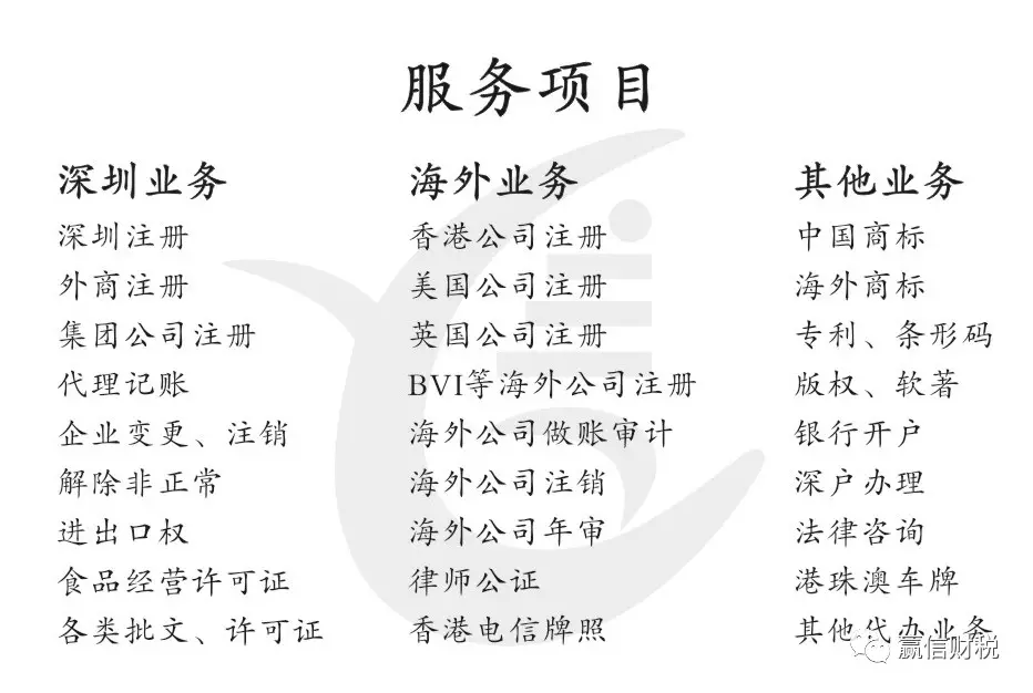 深圳市赢信企业咨询有限公司是一家经政府批准设立并具有专业资格的企业代理服务机构,公司拥有由专业的会计师、税务师及企业高级顾问组成的服务团队,经其注册及管理的公司成千上万家,秉乘“客户至上,诚信服务”的宗旨,服务领域涵盖了工商、财务、法律、金融、投资等,具体包括:注册深圳公司、注册外资公司、注册香港公司及其它海外公司、代理外国企业来华投资、外国人来华工作签、地址挂靠、商务秘书服务、注册国内外商标、代理海内外公司做账、报税、年审等一站式服务,为您的事业发展提供专业的建议以及可行的商业解决方案。